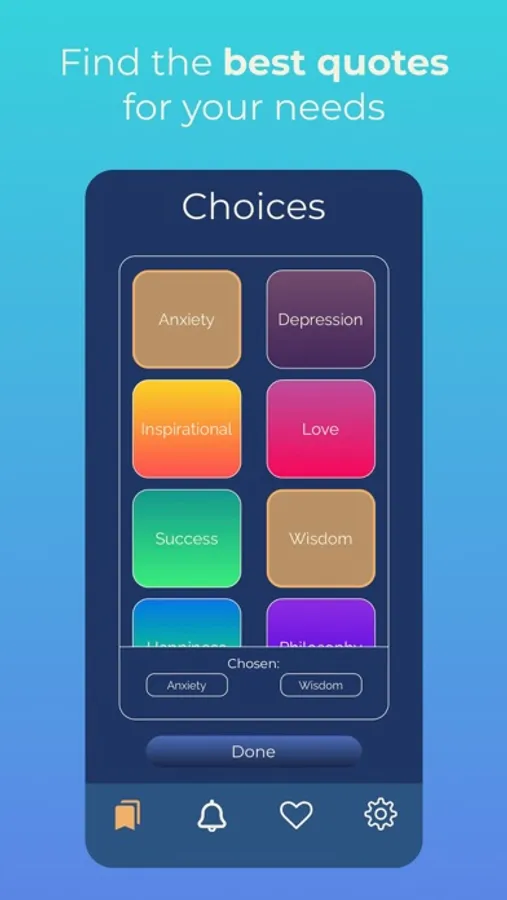 -We offer a variety of different quotes that will help you keep you inspired, motivated, and thinking positively. There is also an option to have reminders sent to you each day with a quote, to continuously remind you that you are amazing.