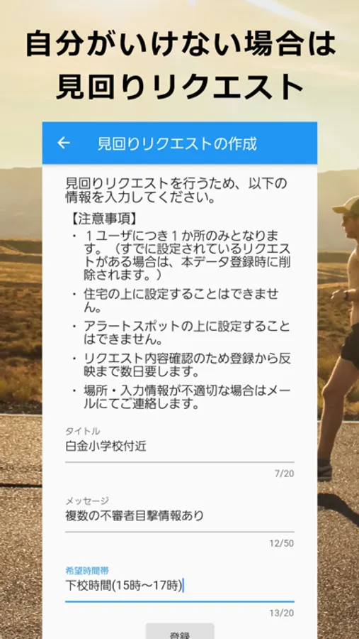 公園や不審者情報をもとに地図上に見回りスポットを表示しております。