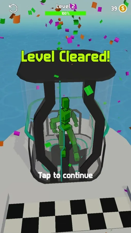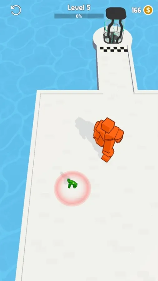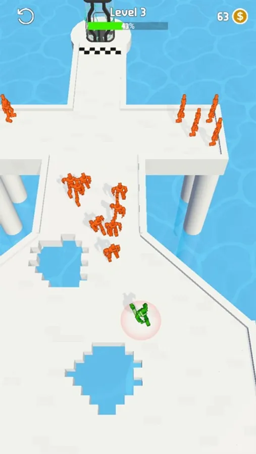 Move the player to reach the end, but avoid the enemies and destroy the roof to drop them.