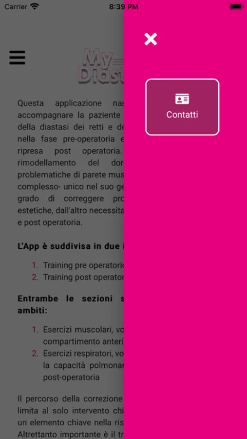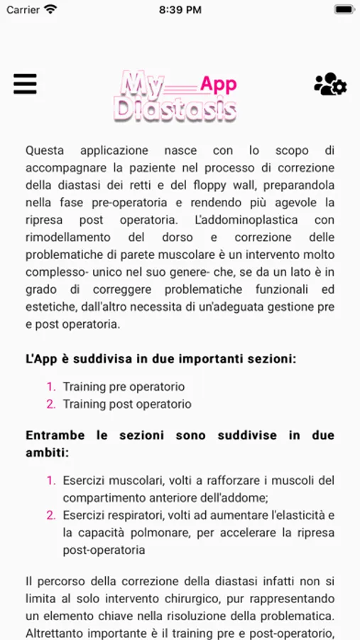 Questa applicazione nasce con lo scopo di accompagnare la paziente nel processo di correzione della diastasi dei retti e del floppy wall, preparandola nella fase pre-operatoria e rendendo più agevole la ripresa post operatoria.