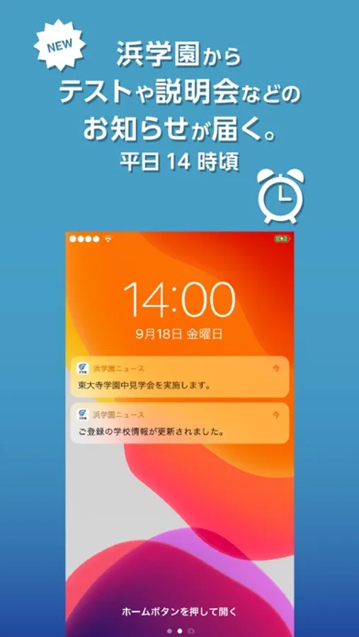 浜学園ホームページに掲載されているテストや説明会などのイベント情報の中からお子様に関係のあるものをお知らせいたします。①新着のイベント②申し込みの開始、の二つの情報を受け取れます。さらに、各々のイベントをお気に入りに登録しておくと、申し込みが開始されたときにもプッシュ通知が届きます。※一度お気に入り登録をされますと、解除しても通知が届きますので、ご了承ください。