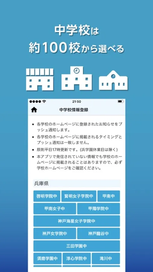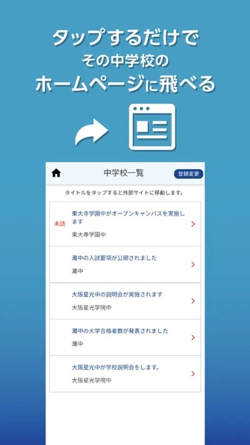 気になる中学校を事前に選ぶだけで、その学校のホームページに掲載されている入試や説明会に関する情報を受け取れます。