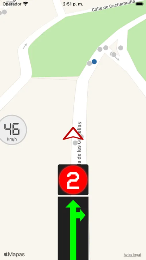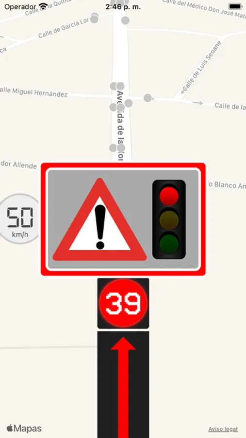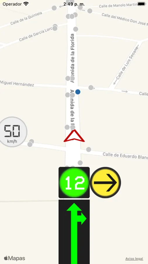 - TRAFFIC LIGHTS: Indication of time, in seconds, for phase change (green, orante or red) and a speed recommendation when approaching a traffic light. The color of the arrows will tell you if, at the current speed, you will be able to pass the next traffic light or if you should otherwise slow down. This enables the adaptation of driving according to whether or not it is possible to go green according to the time remaining for the phase change. In this way, hard acceleration and braking can be avoided, helping to reduce emissions and consumption. The application will also alert when it detects a risk of exceeding a red traffic light.