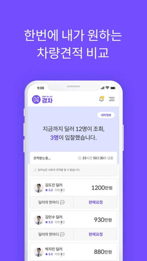 딜러들에게 견적을 받으시면 원하는 딜러를 선택해서 판매요청을 할 수 있습니다.