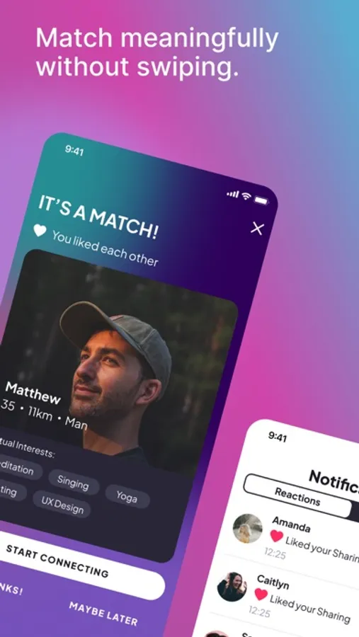 Designed by intimacy and relationships experts, Lua helps you go deep with your match. The intentional and swipe-free design makes online dating feel more like a playful mystery and less like online shopping.