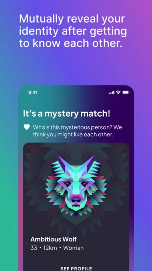 - Tap ‘like’ and match with people you’re interested in, then discover each other deeply ‘in the mystery’ (you’ll know you liked them, but you won’t know exactly who it is till you ‘reveal’)