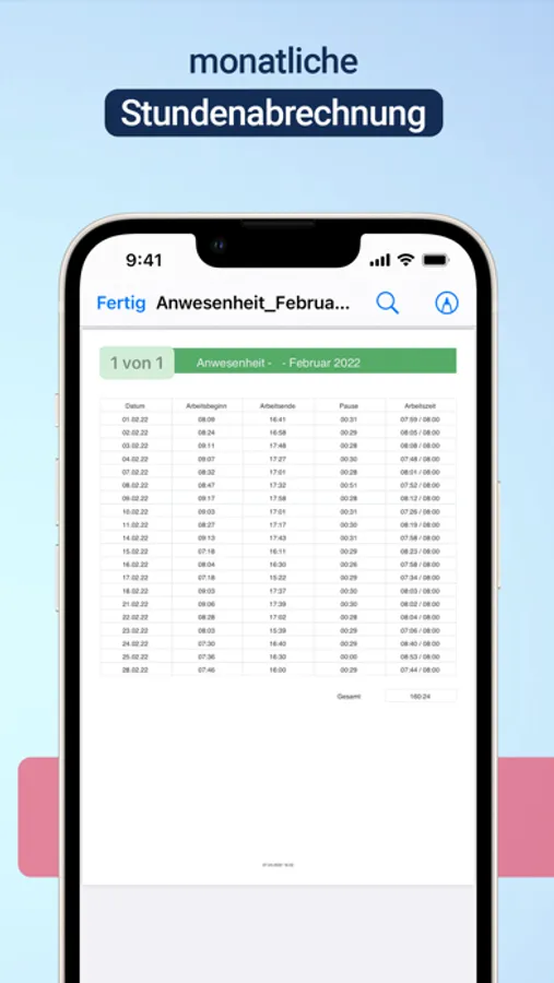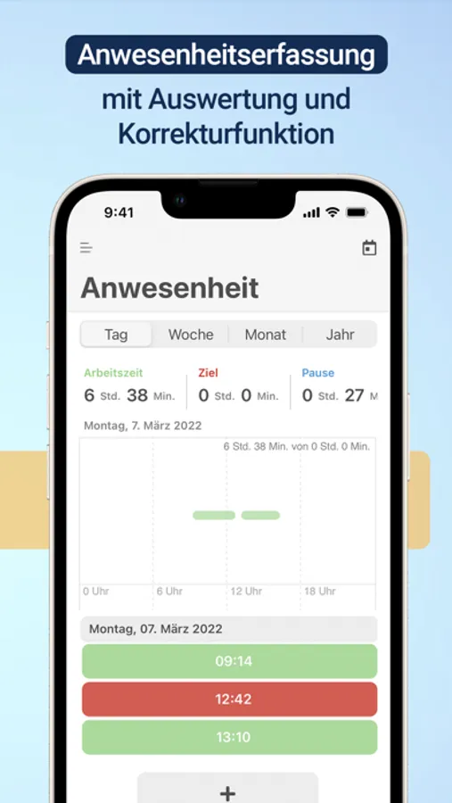 • Werte deine Tages-, Wochen- und Monatsarbeitszeiten in Diagrammen aus und behalte einen Überblick über deine Überstunden