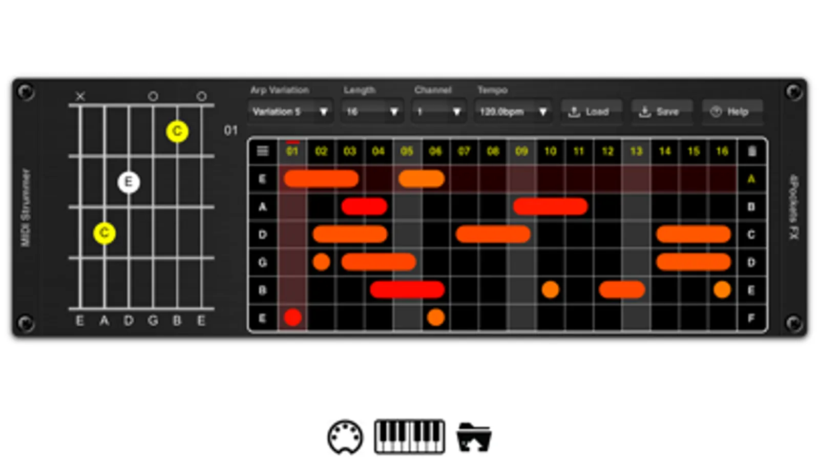 MIDI Strummer is an AUv3 plugin designed to simulate guitar strumming and picking techniques. It can used to generate MIDI note data which can be sent to either an external synth of choice or the internal soundfont engine.