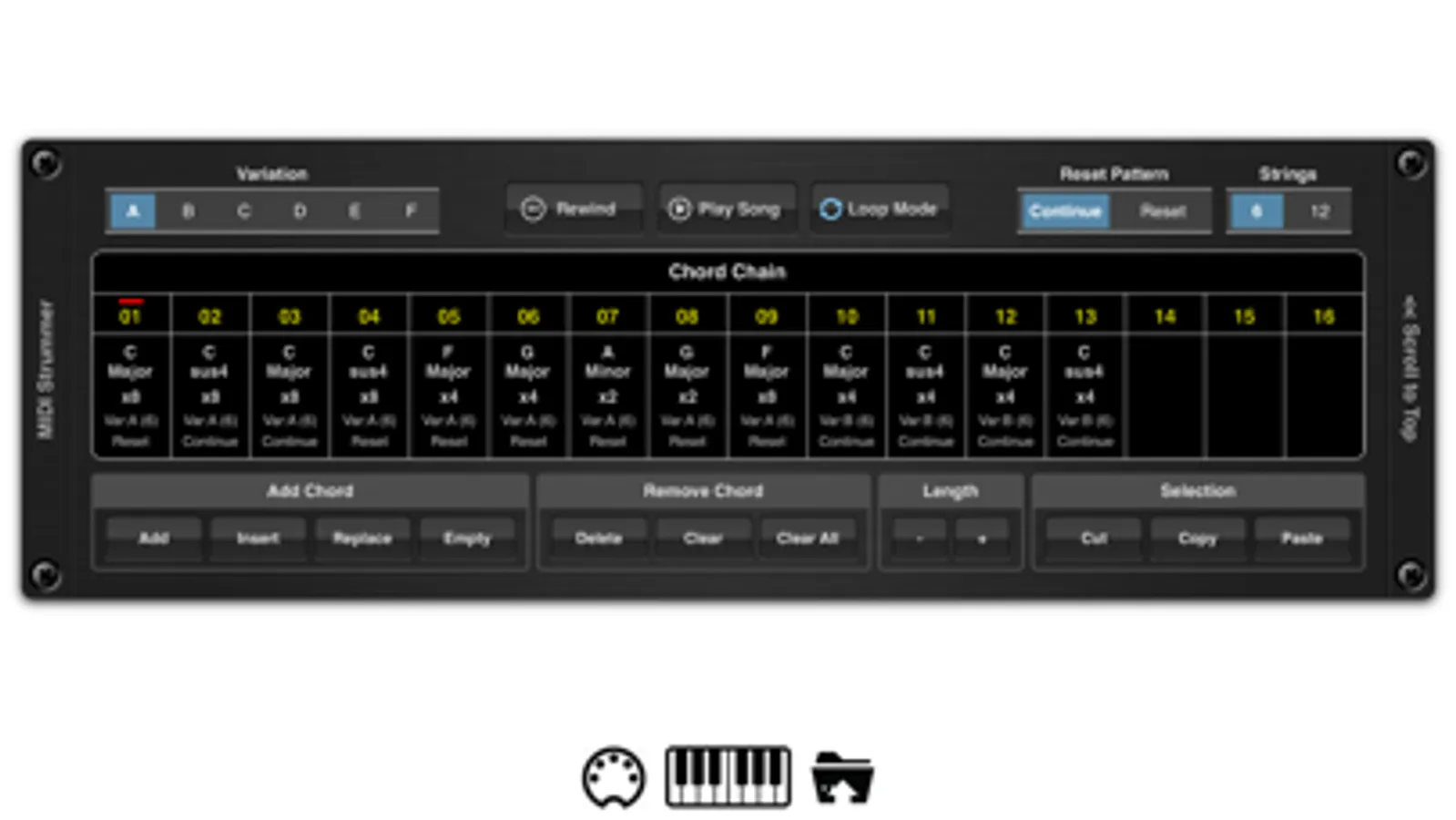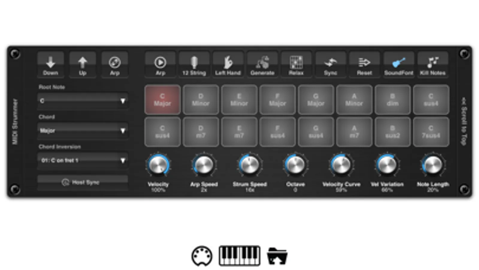 The inbuilt soundfont player allows you to import all your favourite .SF2 and .DLS soundfonts and use them as a sound source. MIDI strummer has a set of 16 definable chord pads that can hold a series of chords, which in turn can be triggered remotely via MIDI messages or by tapping the pads.