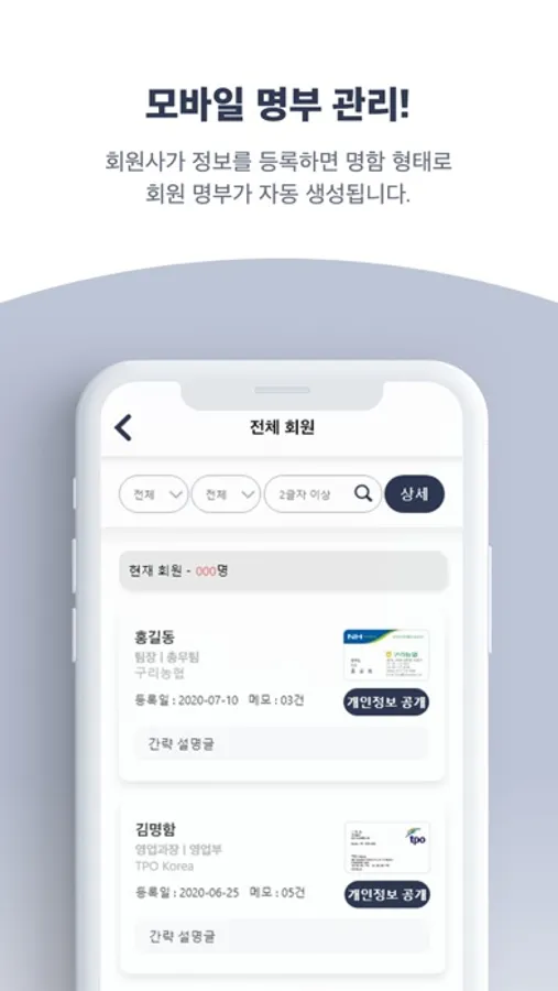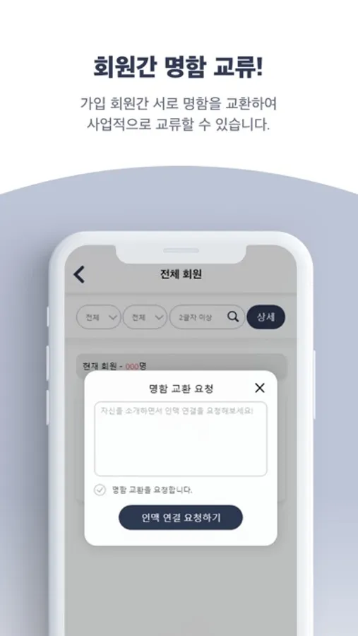 개인정보 보호를 위해 회원 명부는 개인정보(휴대폰번호, 이메일) 비공개 열람 되며, 명함 교환 요청, 수락을 통해 서로 교환된 회원만 개인정보가 열람 됩니다.