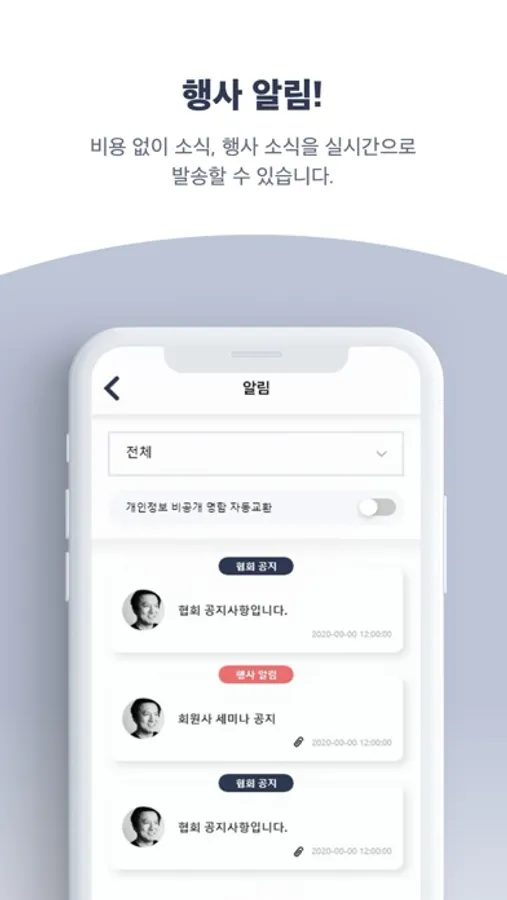 공지사항, 행사안내, 소식을 등록하면 앱을 설치한 모든 회원에게 글 개시 즉시 모바일 푸쉬 시스템을 통해 공지사항이 실시간으로 발송되어 비용을 절감할 수 있습니다.
