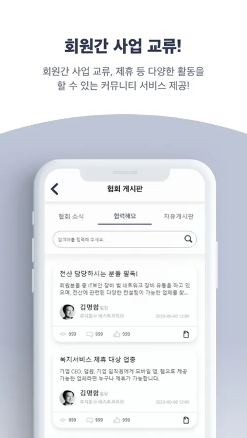 회원간 명함 교환을 통해 서로 교류할 수 있으며, 사업 교류 커뮤니티 서비스를 통해 사업 교류, 제휴 가능하도록 서비스를 제공해 드립니다.