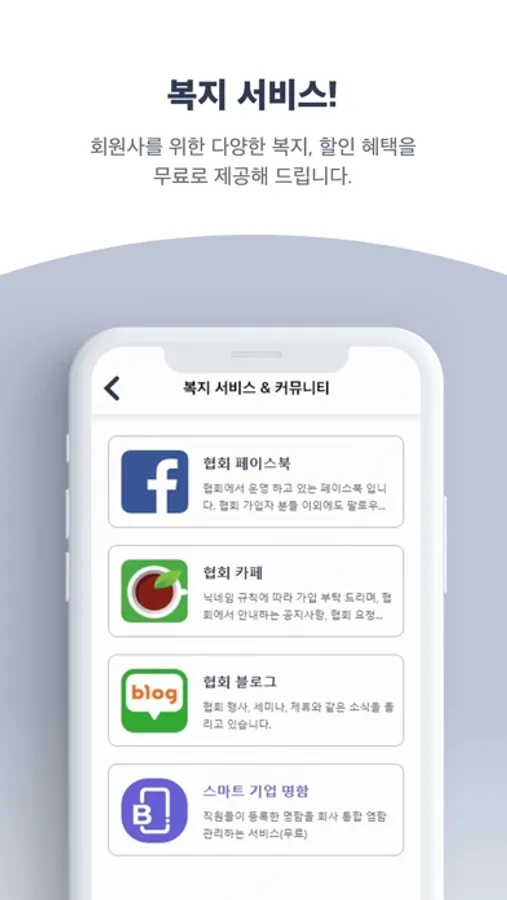 회원을 위한 다양한 복지서비스와 할인 혜택을 제공해 드리며, 협회, 단체와 계약된 서비스가 있는 경우 자유롭게 별도 적용할 수 있습니다.
