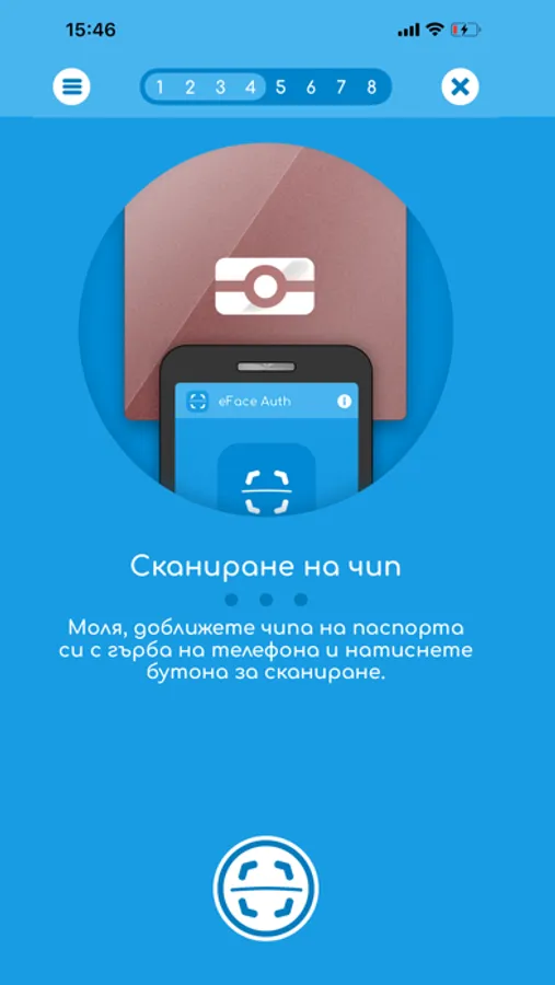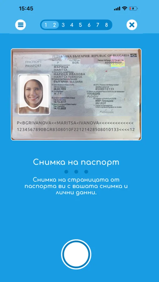 1. Taking photos of the Passport with the smartphone’s camera as well as a machine-reading process where the information from the digital part of the Passport has being read via the NFC tool of the smartphone.