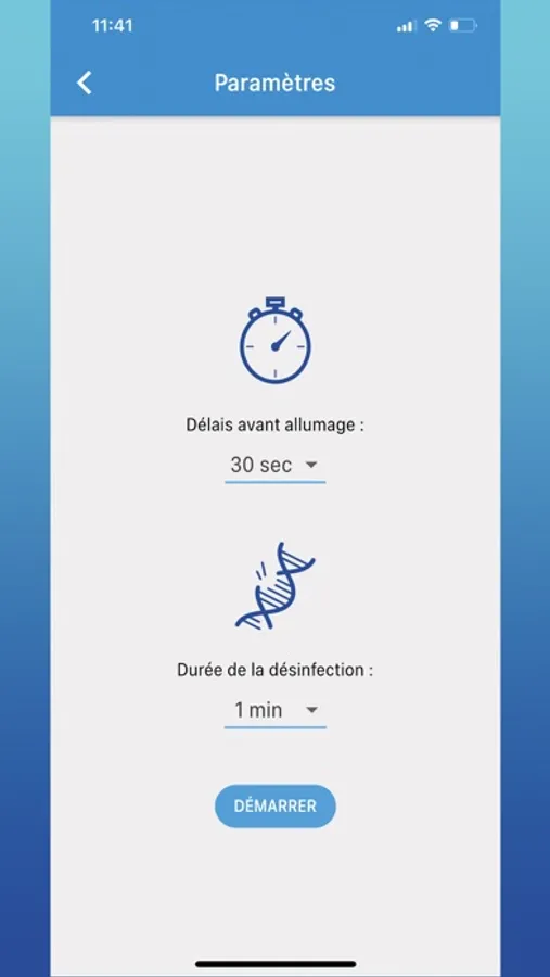 Une fois l’application lancée et votre profil complété, vous pourrez décider du délai avant activation des rayons UV-C et également de la durée d’exposition. Programmez ainsi la désinfection selon vos besoins et vos contraintes : par exemple si votre local est plutôt petit vous pouvez adapter le temps de désinfection et diminuer le temps d’exposition.