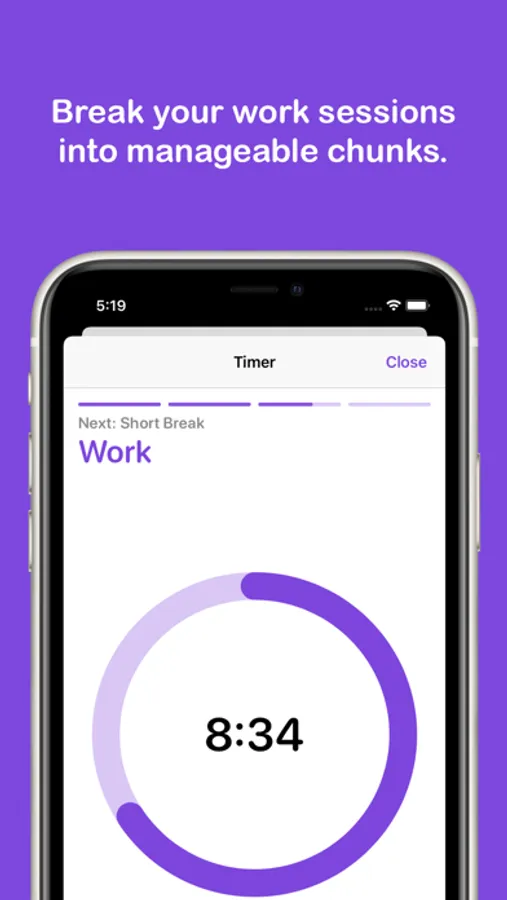 - Stay on track with a smart work timer that tells you when it's time to take a break.