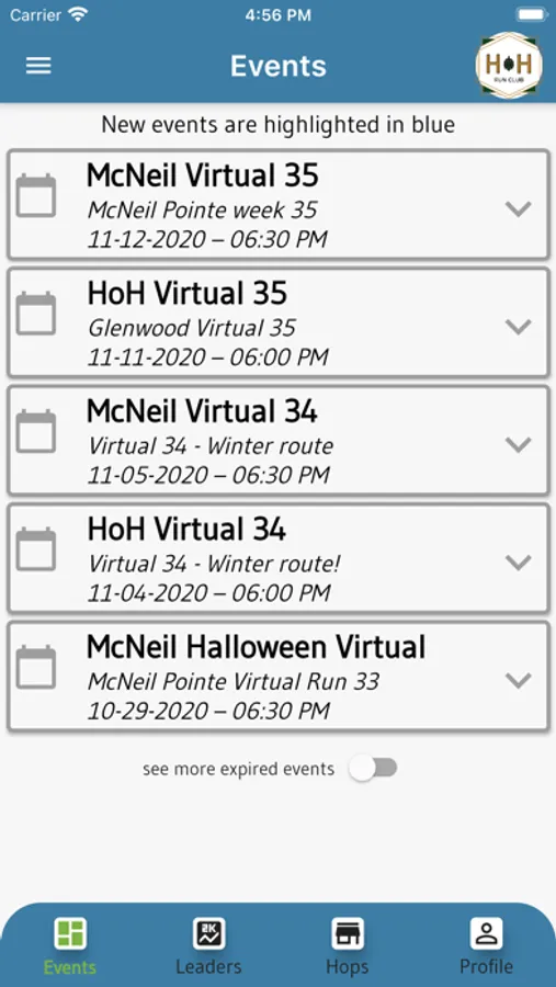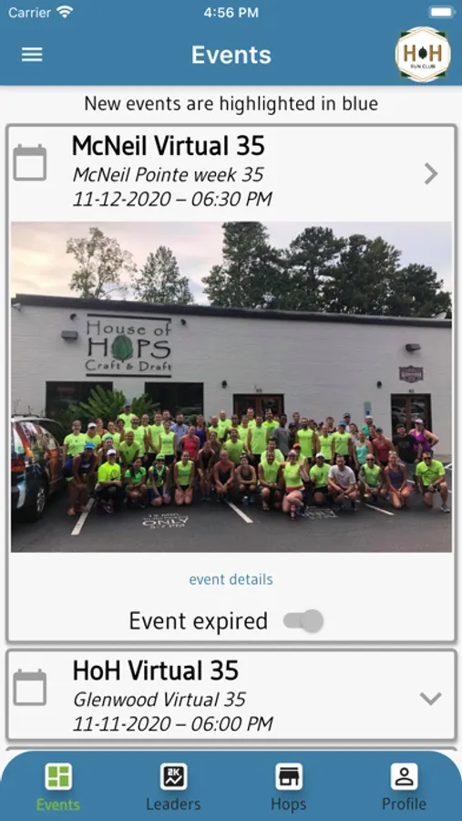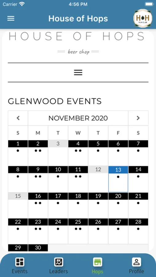 Event app for the House of Hops Run Club. This application displays the upcoming events for the House of Hops Run Club. It allows users to check into those events. Users can compete for the top spot on the leaderboard by attending events.