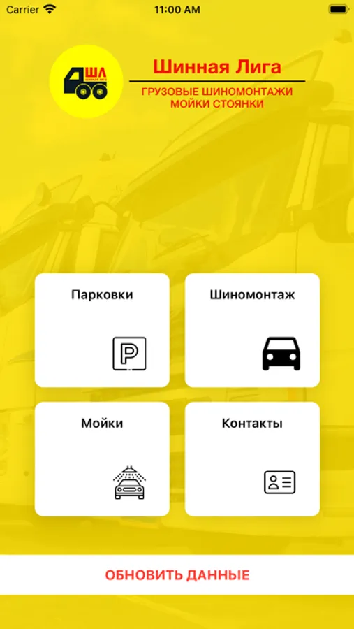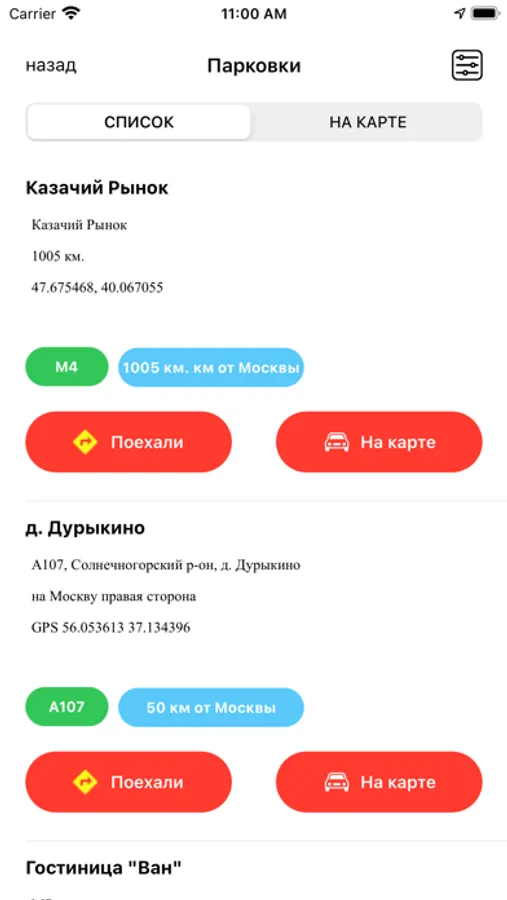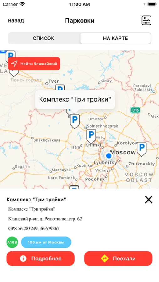 Приложение показывает список парковок, шиномонтажей и моек ШИННОЙ ЛИГИ.