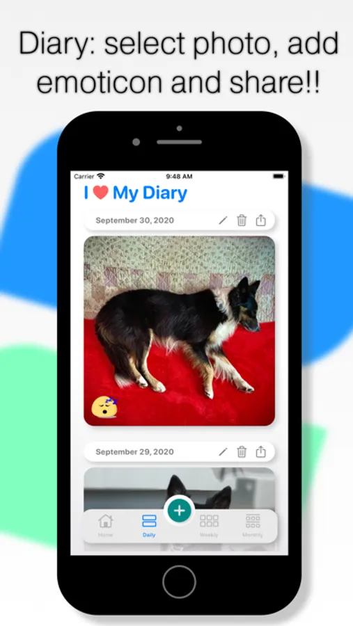 You also have a Diary where you can save a photo every day and add a personalized emoticon that summarize the day. Share every single day or the summary of your week on social networks!
