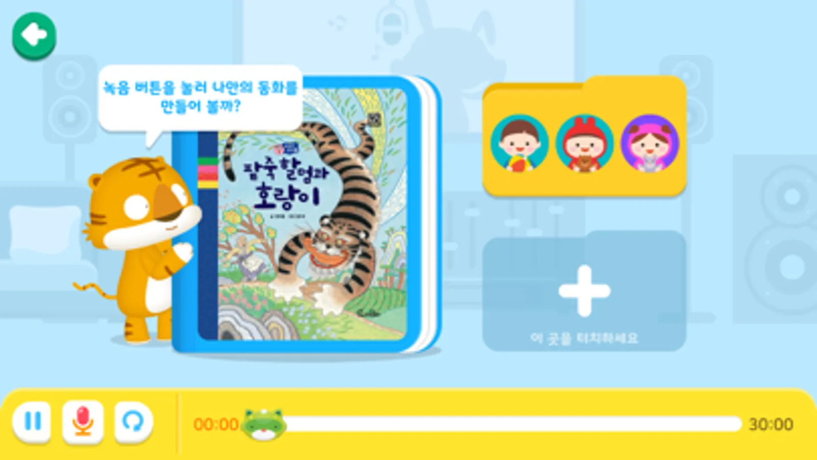 이야기를 가족이나 친구들과 함께 읽고 녹음하여 나만의 동화를 만들 수 있어요. 직접 만든 나만의 동화는 언제든지 다시 들을 수 있어요.