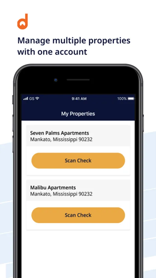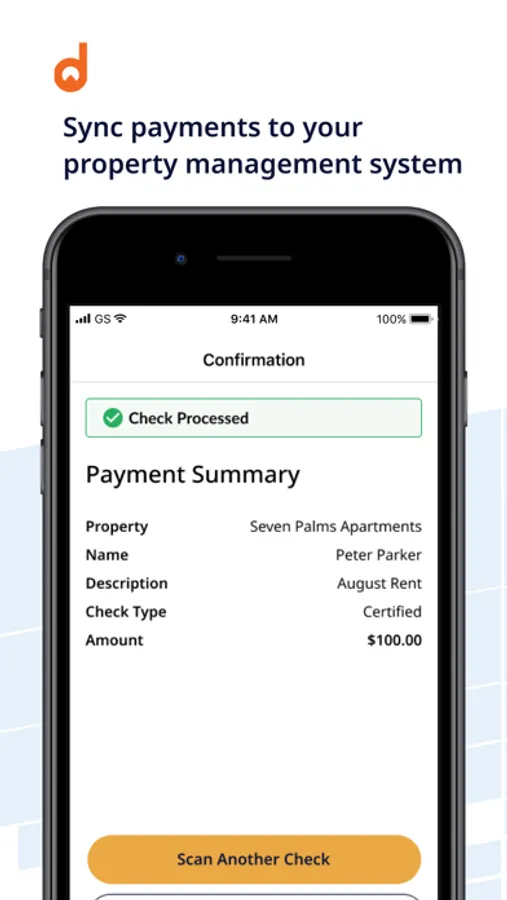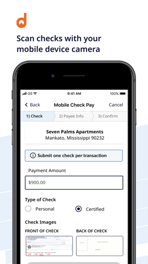 Accept Checks On-The-Go: With the Domuso property manager mobile app, you can scan, submit, and post check payments from your mobile device. Just snap a photo of the front and back of the check using your phone or tablet camera. Domuso automatically syncs collected payments to your existing property management software.