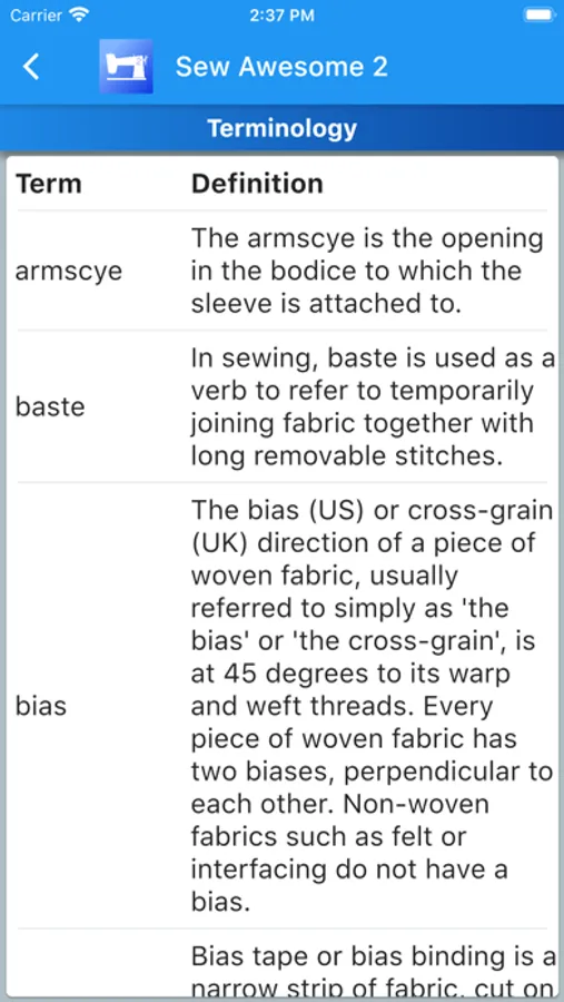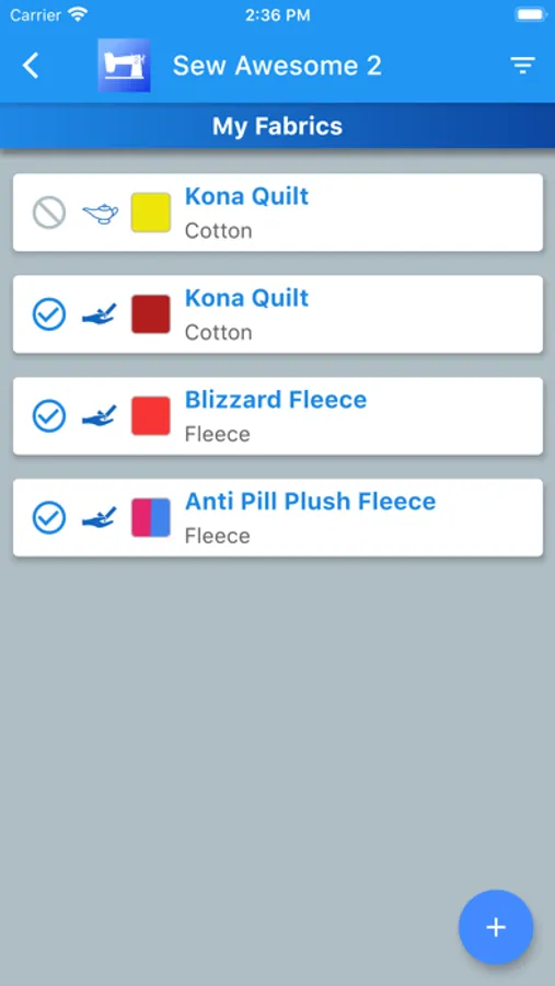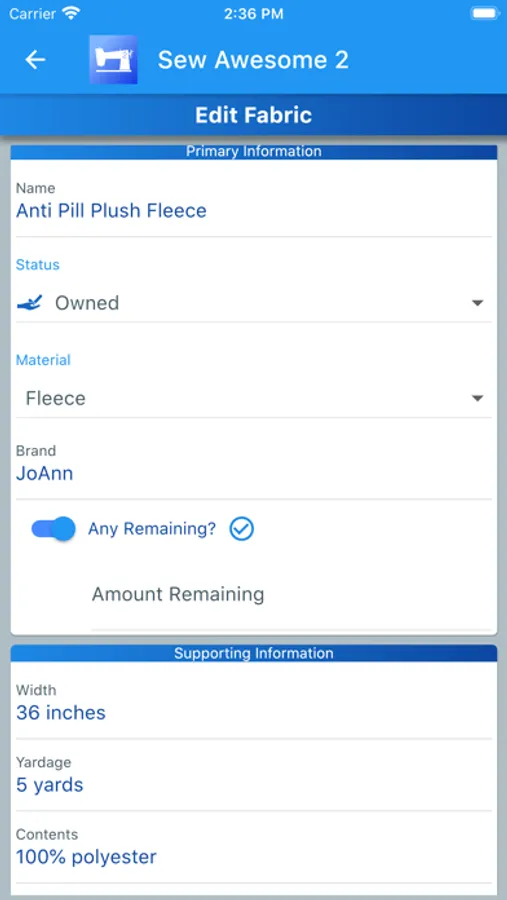 All data is stored in the cloud, so it is available across multiple devices. Store detailed information about each of the sewing categories above. Pro users can add pictures and PDFs to each item.