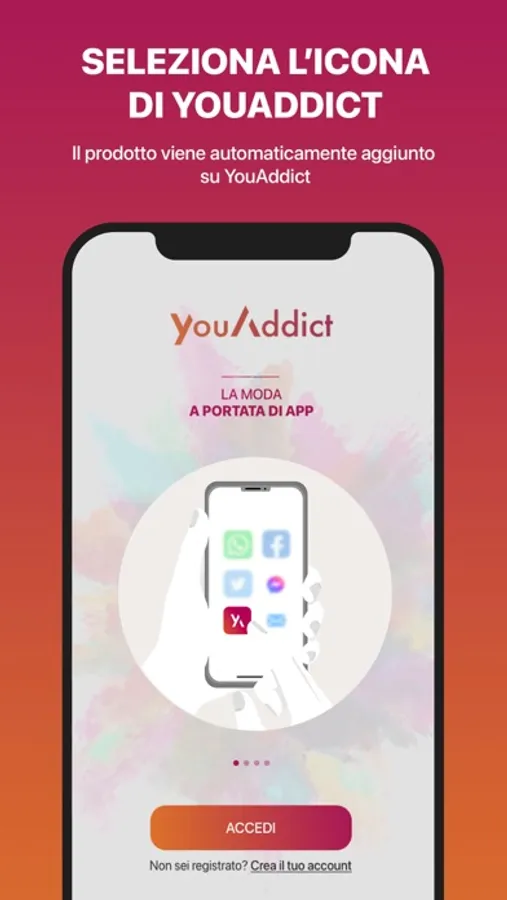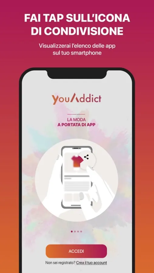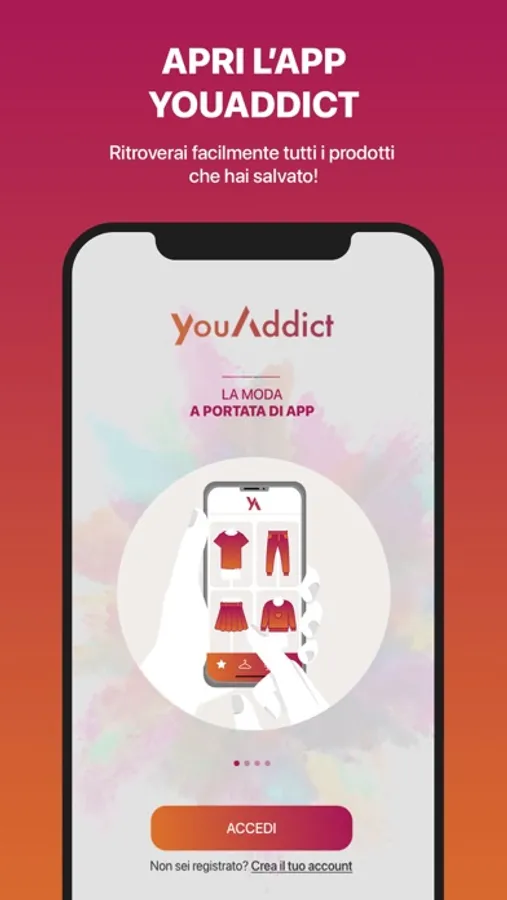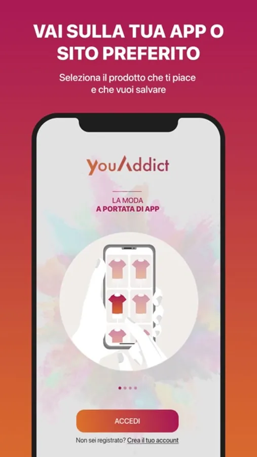 1. Esplora i siti che preferisci e salva i capi che ti piacciono, tutti in un unico ambiente. Con YouAddict basta un tap!