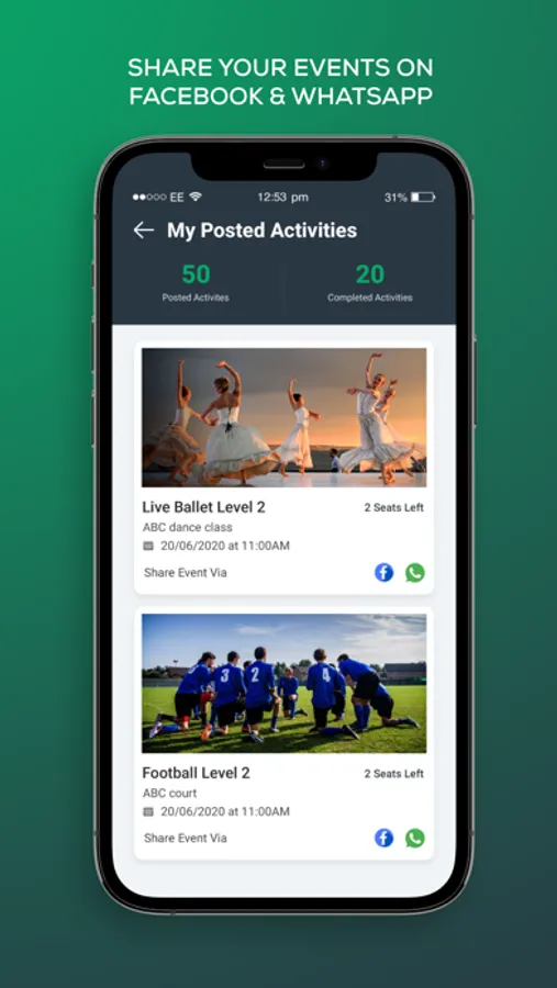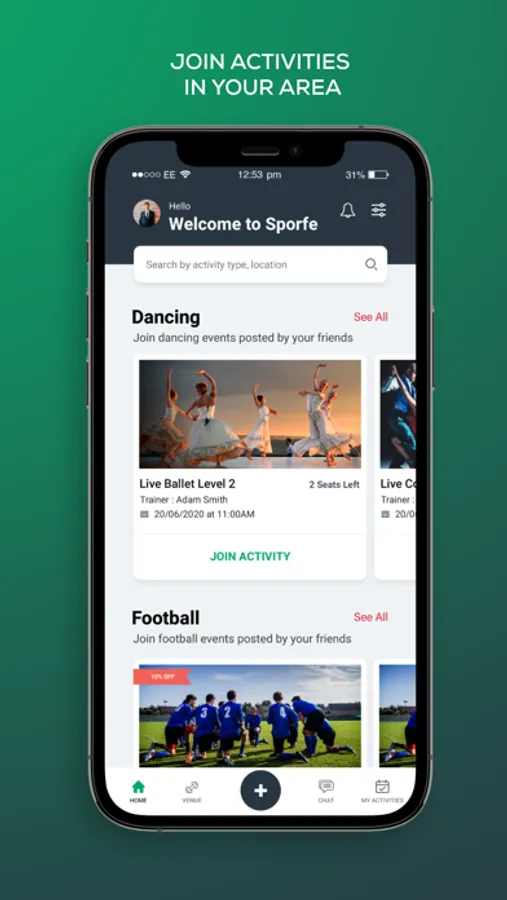 Browse through all the activities and fitness classes that are happening in your area. You can join activities that your community members and nearby fitness venues have created like Football, Basketball, Tennis, Running, Swimming, Cycling, Skating, Yoga, Pilates, Zumba, Dog walking and more.