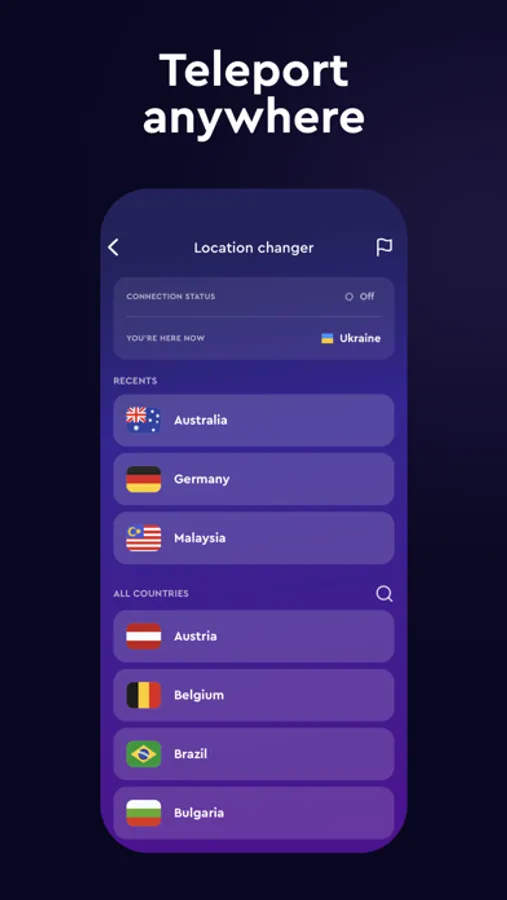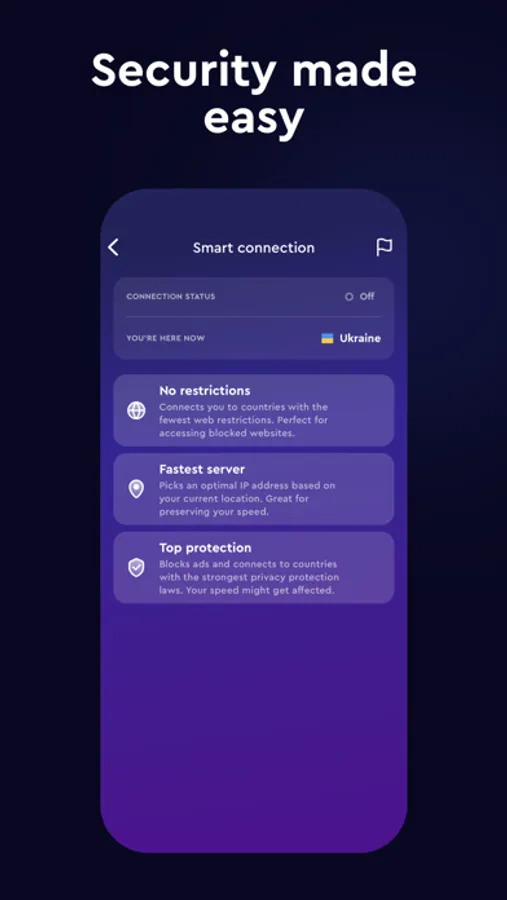 You don’t need to dive into the online security world to use ClearVPN. Just turn on VPN for better protection or decide to which country you want to connect – we will do the rest. One tap, and you're clear to go!