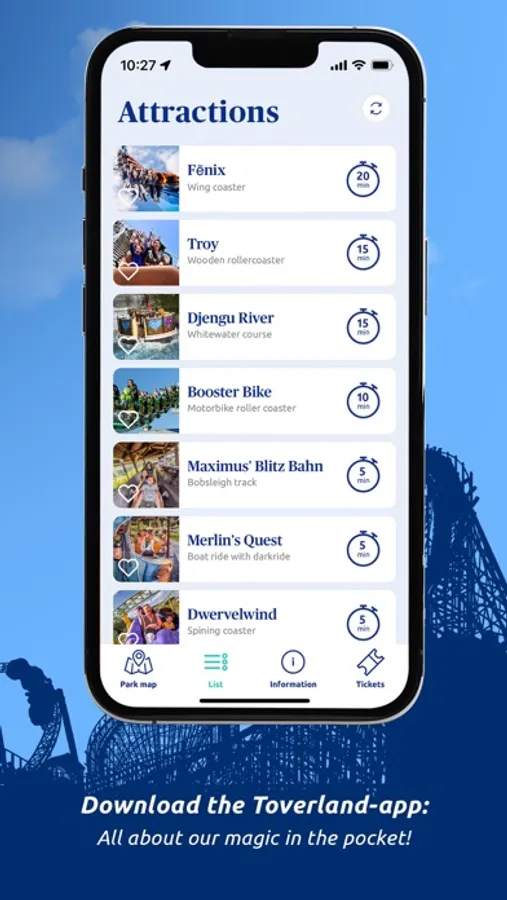 The best preparation for your day is done with the Toverland app! Find the most exciting attractions or find out where to go for the tastiest snacks. During your visit you can see at a glance what the waiting times are for your favorite attractions, which catering outlets are open and when your favorite show starts. This is how you get the most out of your day!