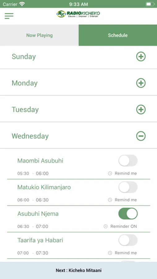 Radio Kicheko App simplifies online listening to Radio Kicheko Live radio programs anytime and from anywhere in the world. The App instantly plays current program on air while showing next upcoming program. Users can see and peruse through the weekly program schedule and set a reminder for their preferred program. The App also has a timer to stop after set time.