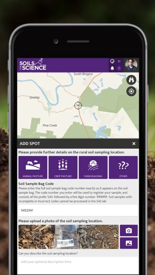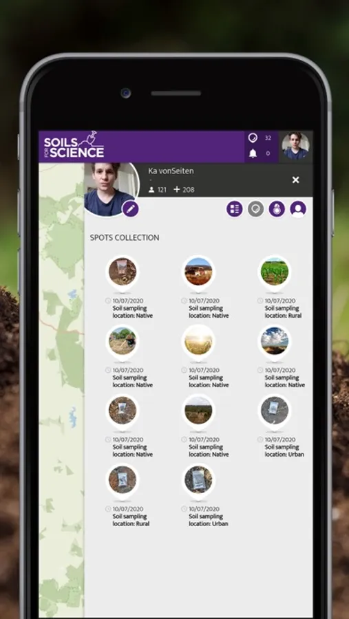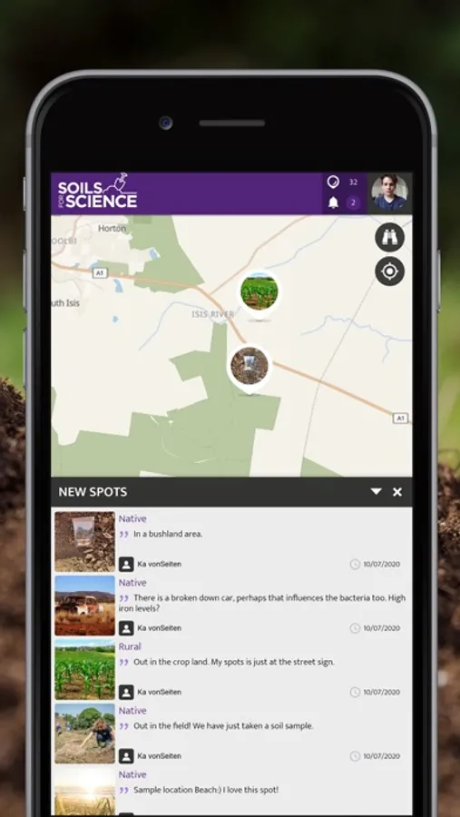 SOILS FOR SCIENCE Soils for Science (S4S) is a citizen science initiative of The University of Queensland, Institute for Molecular Bioscience. S4S provides the public with free sampling kits (visit soilsforscience.org.au) to collect soil samples rich in microbial biodiversity (bacteria and fungi). Pure microbes will be isolated by UQ researchers and used as a resource to search for new and improved antibiotics. High-resolution images of the microbial communities found in each soil sample will be uploaded to the S4S website, where the public can find their own sample(s), to zoom in and view the marvellous and miniature world of microbes. The App itself is running on the SPOTTERON Citizen Science platform.
