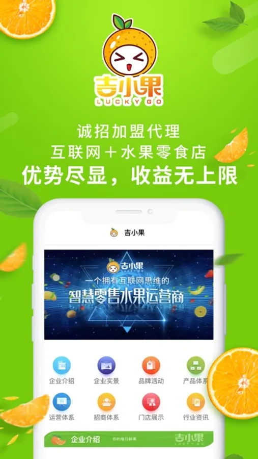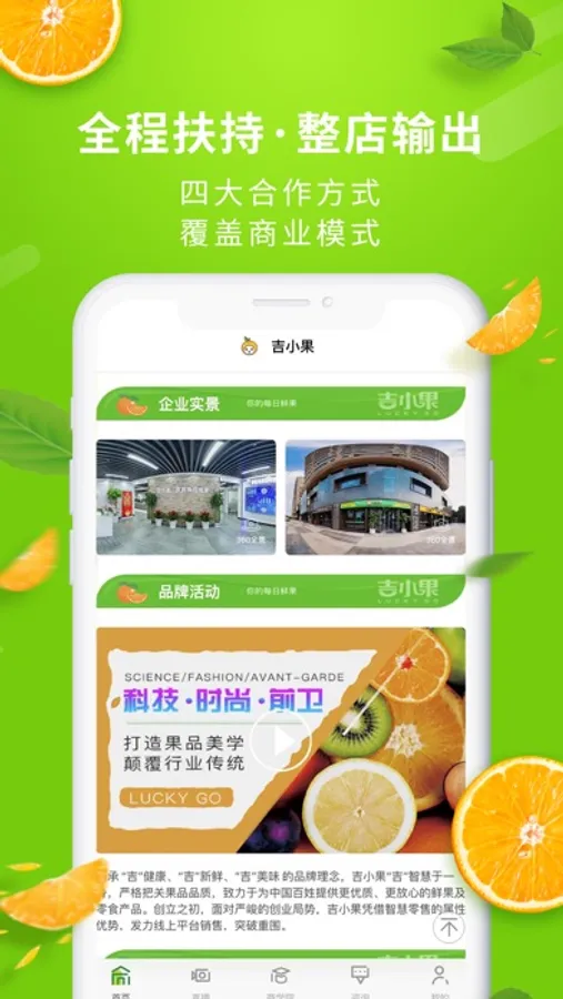 企业全方位展示:各版块清晰介绍企业的产品体系、运营体系以及品牌活动、店面展示、加盟商活动风采等。通过企业实景,给各位创业者真实展现总部的规模、环境,您不用实地考察也能直观了解项目。通过运营模式的精锐解读,让创业者快速掌握果品行业投资先机,盈利快人一步。