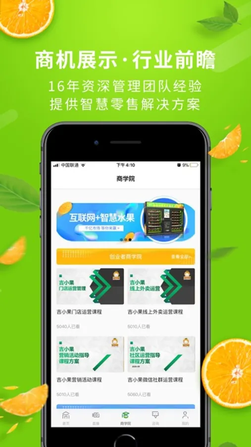商学院:通过视频、文字等系列课程,并结合品牌产品,让创业者捕获到创业技巧、学习到果品行业专业知识的同时把握智能新零售发展趋势,助力投资新手专业化转型。