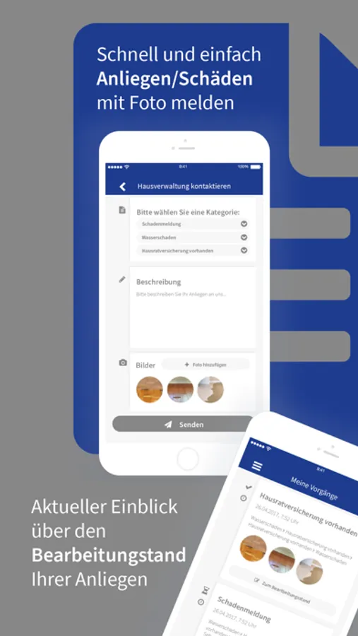 Als Mieter oder Eigentümer können Sie Schäden oder Anliegen direkt mit Fotos über unsere App melden. Ihre Anfragen stehen unseren Mitarbeiten dann zur Verfügung und können auch an Handwerksbetriebe weitergeleitet werden.