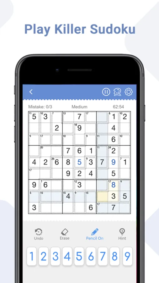 Killer Sudoku is a logic-based number puzzle game and the goal is to place 1 to 9 digit numbers into each grid cell so that each number can only appear once in each row, each column and each mini-grid. With our Sudoku puzzle app, you can not only enjoy sudoku games anytime anywhere, but also learn Sudoku techniques from it.