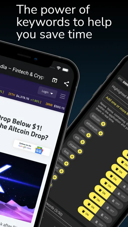 Crypto news alerts is a cryptocurrency news tracking application. By simply defining some keywords you will save time searching for news of your interest. You will receive the news as a notification without opening the app. You will receive real time cryptocurrency news for any altcoin or expression you define as keyword.