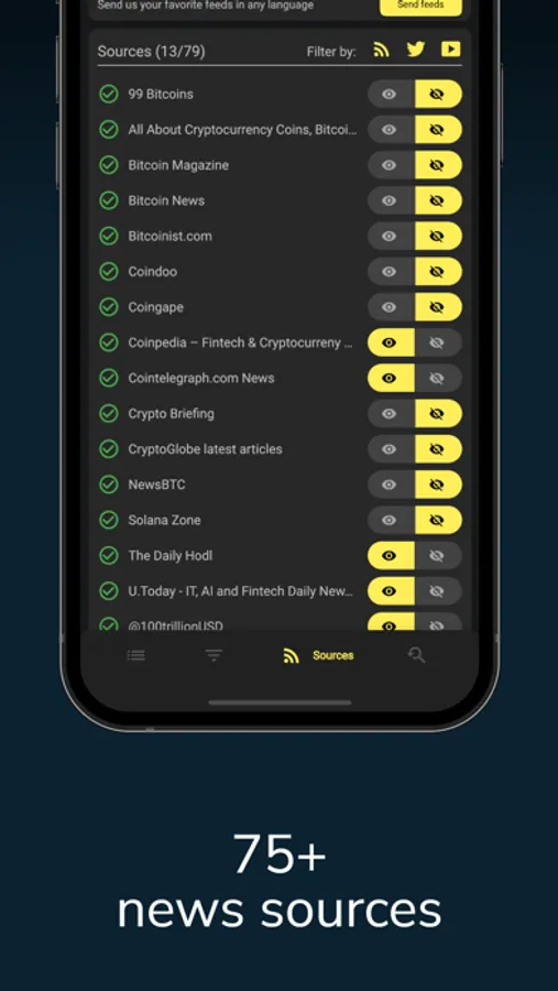More than 75 different data sources, including websites, analysts from twitter and youtube channels related to cryptocurrency market.