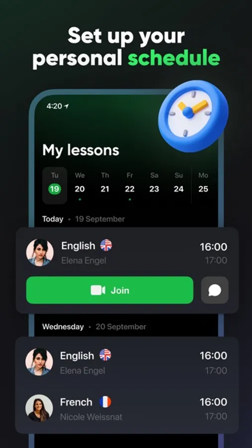 Choose from 30-, 45-, and 60-minute sessions and the date and time that suit you. You can have your lessons from anywhere in the world as long as there's an internet connection.