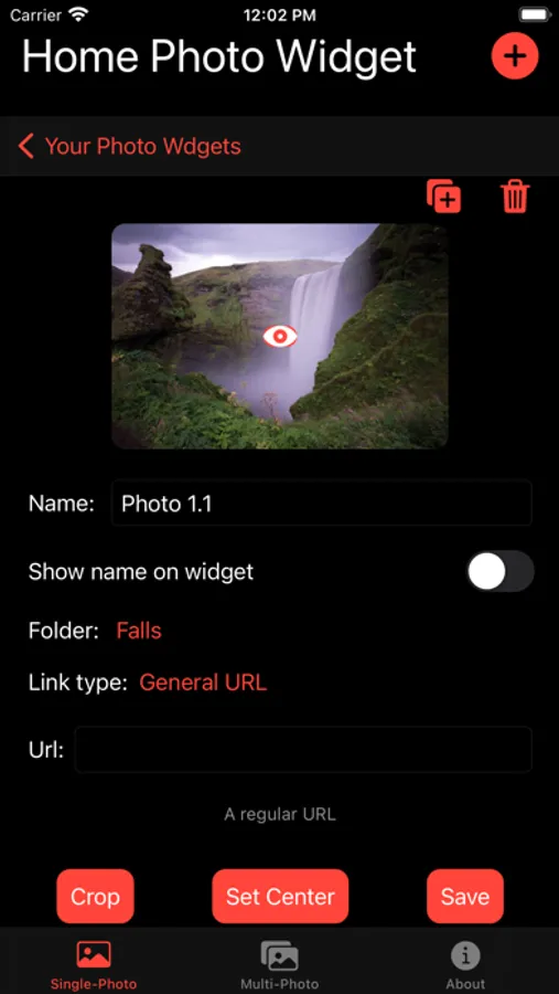 3. Select the photo in the app to edit its name and to choose wether you want the widget to show it or not (and its color). If the picture is wide or tall, be sure to set its center to make sure the important part is displayed on any sized widget.