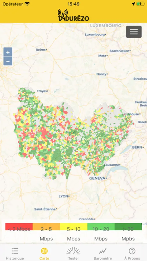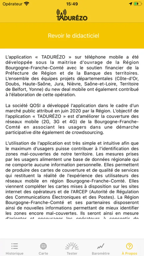 La société QOSI a développé l’application dans le cadre d’un marché public attribué en juin 2020 par la Région. L’objectif de l’application « TADURÉZO » est d’améliorer la couverture des réseaux mobile (2G, 3G et 4G) de la Bourgogne-Franche-Comté en associant les usagers dans une démarche participative dite également de crowdsourcing.
