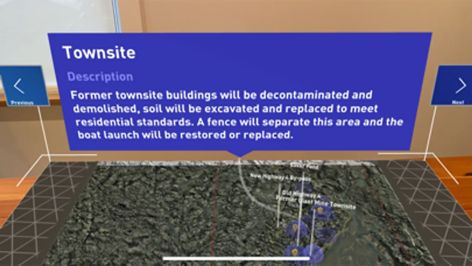 Learn about the reclamation and remediation plans of the Giant Mine in Yellowknife, NWT. This app uses augmented reality (AR) to show an overview map of the area with clickable callouts that contain more information on the plans. Users can also use the forward and back buttons to move through the different scenes, view the underground, and see immersive views of the site post reclamation.