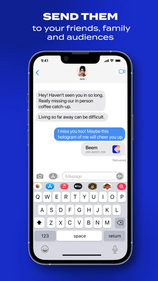 Beem enables users to send pre-recorded holograms or livestream as a hologram to friends, family, consumers and customers. Your hologram can be viewed and shared with anyone through text, email, social media and literally everywhere.
