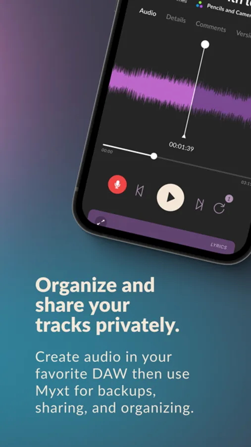 Create audio in your favorite DAW then use Myxt for backups, sharing, and organizing. Web and mobile apps available. Listen to your work everywhere, easily.