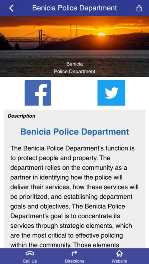 This app is for our employees and the community they serve. It contains information about our Department as well as safety and crime prevention tips. Benicia Police Department employees will have access to a full range of wellness tools.