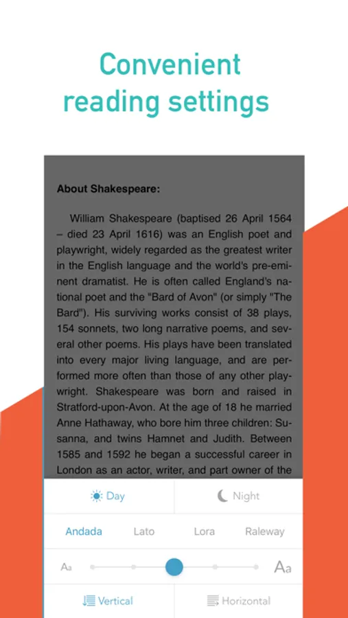 - Optimize your reading experience: adjust the font size, font type, background colors (daytime and nighttime reading), margin, alignment as well as brightness to best suit your preference.