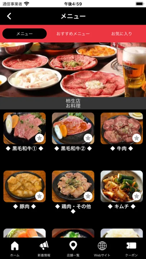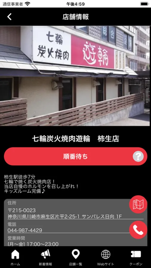 (アプリのクーポンページの上部に利用店舗がかかれています。タップすると利用可能店舗一覧が出ます。お出かけ予定の七輪炭火焼肉 遊輪店舗を確認して、会計時にスタッフへお見せください。)