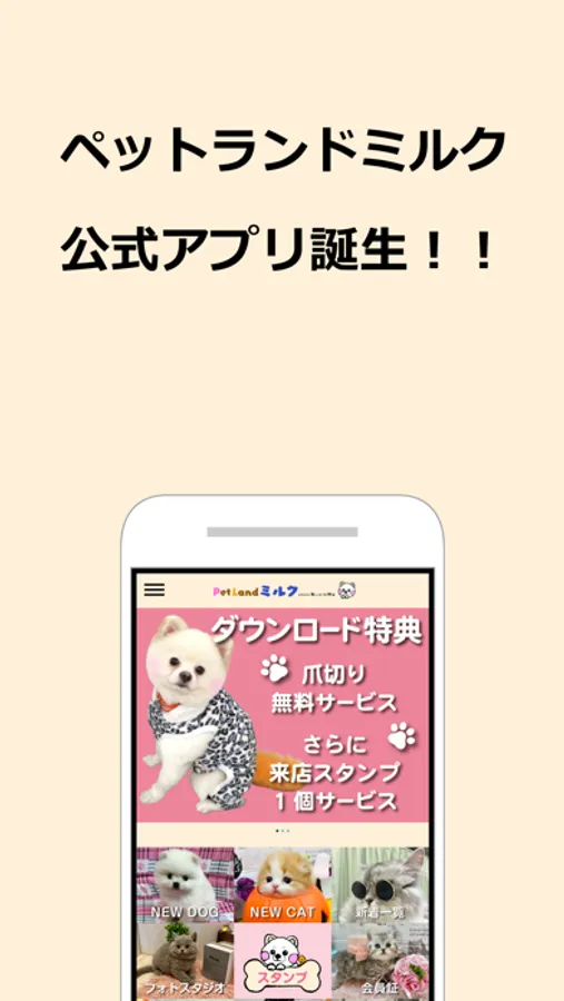 ペットランドミルク公式アプリでは、最新情報はもちろん、お得なクーポンやスタンプカードなど様々なコンテンツを掲載中です。
