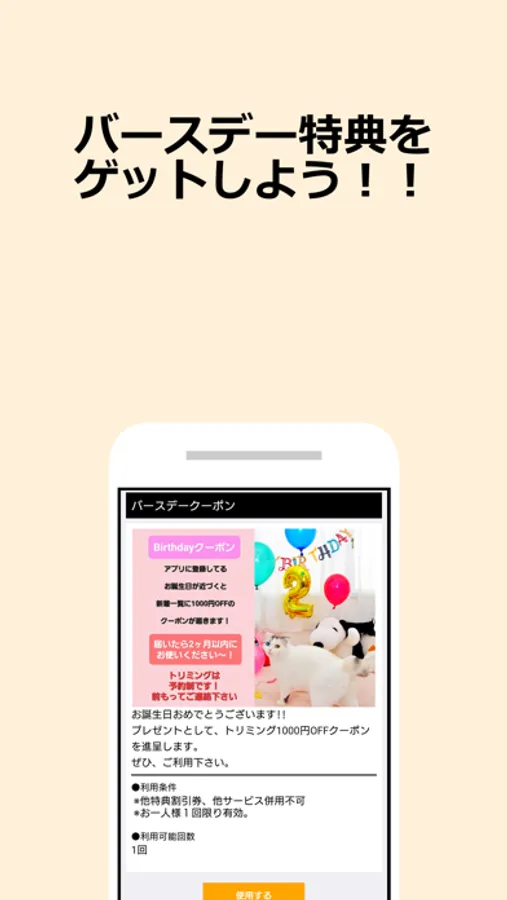 プロフィールに生年月日を入力して頂くと、お客様の誕生日にご利用出来る限定クーポンがご利用頂けます。