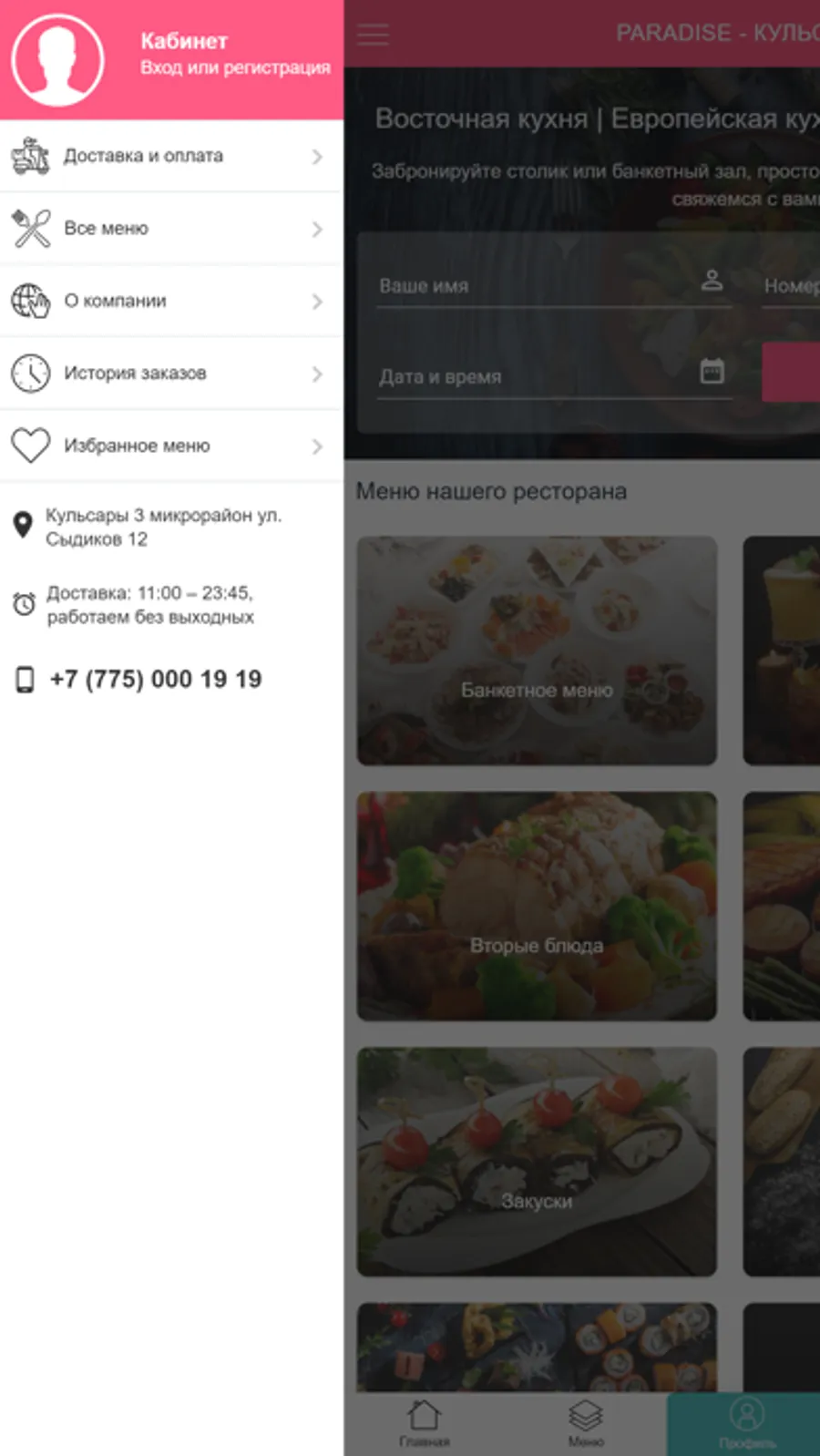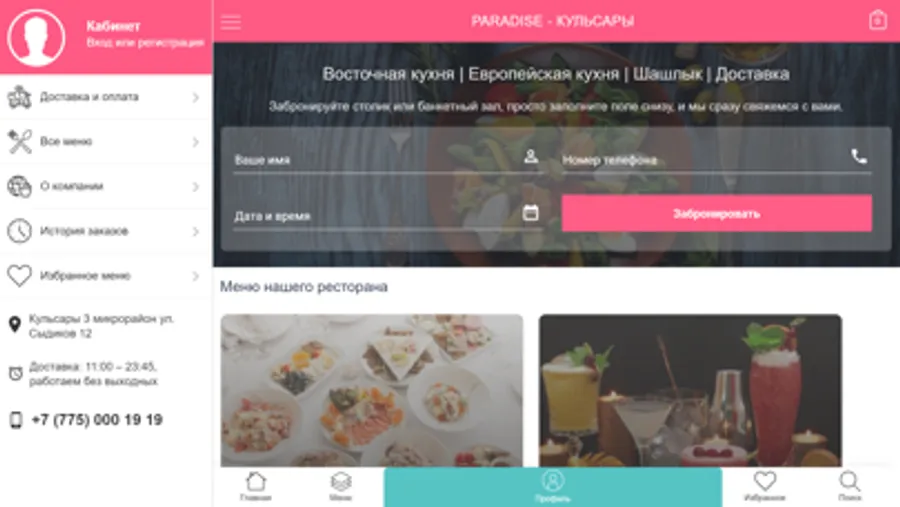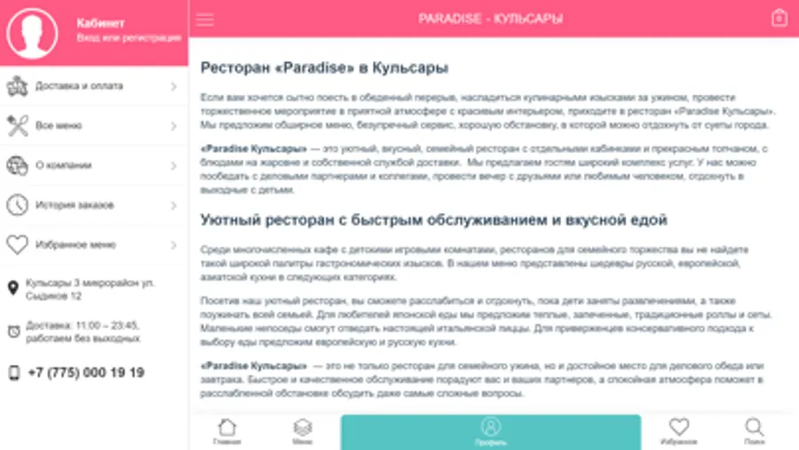 «Paradise Кульсары» ― это уютный, вкусный, семейный ресторан с отдельными кабинками и прекрасным топчаном, с блюдами на жаровне и собственной службой доставки. Мы предлагаем гостям широкий комплекс услуг. У нас можно пообедать с деловыми партнерами и коллегами, провести вечер с друзьями или любимым человеком, отдохнуть в выходные с детьми.